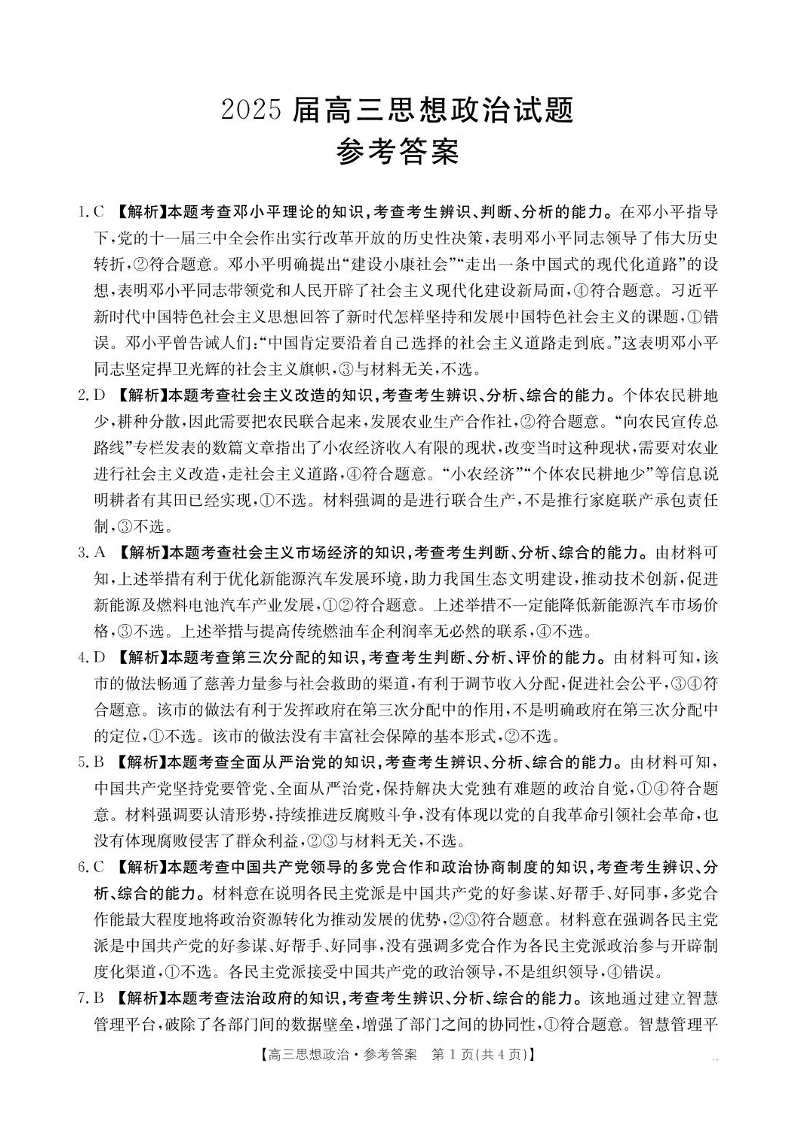 四川省部分学校2024-2025学年下学期2月高三开学考试政治答案