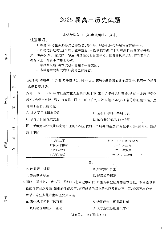 四川省部分学校2024-2025学年下学期2月高三开学考试历史