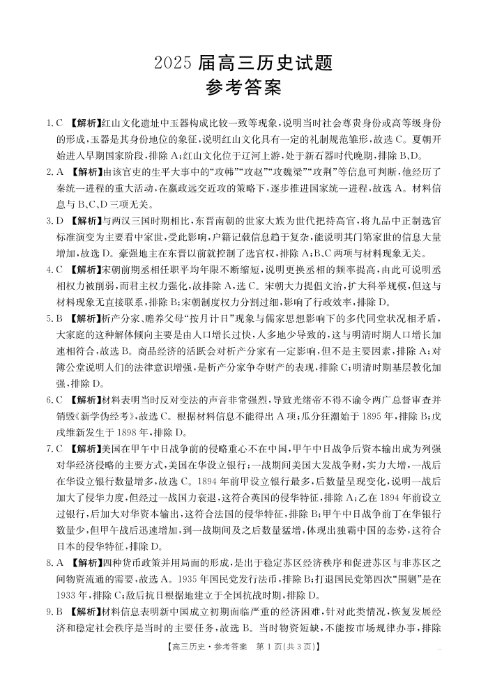 四川省部分学校2024-2025学年下学期2月高三开学考试历史答案