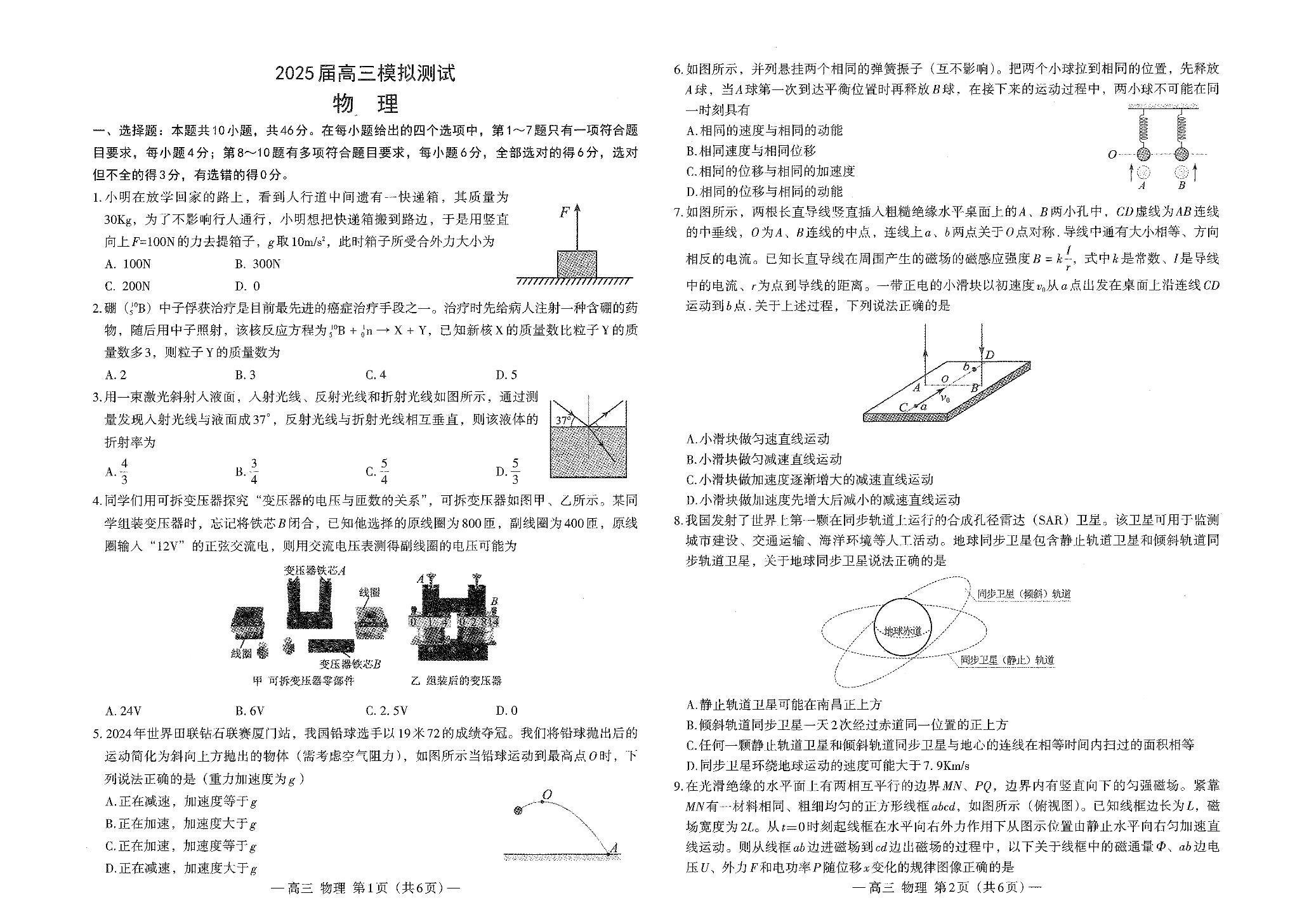 江西省南昌市2024-2025学年高三第一次模拟测试(一模)物理