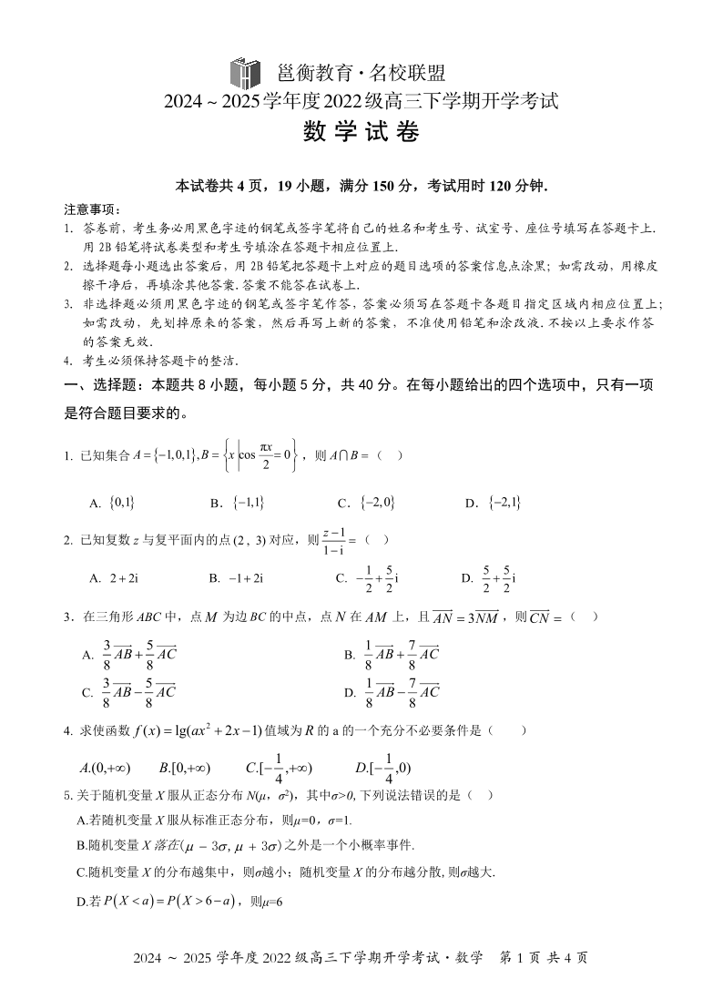 广西省邕衡教育·名校联盟2024-2025下学期高三开学考试数学