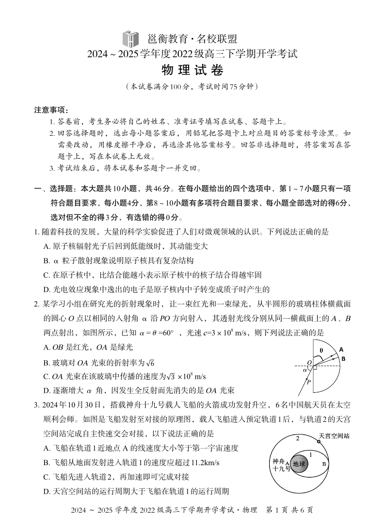广西省邕衡教育·名校联盟2024-2025下学期高三开学考试物理