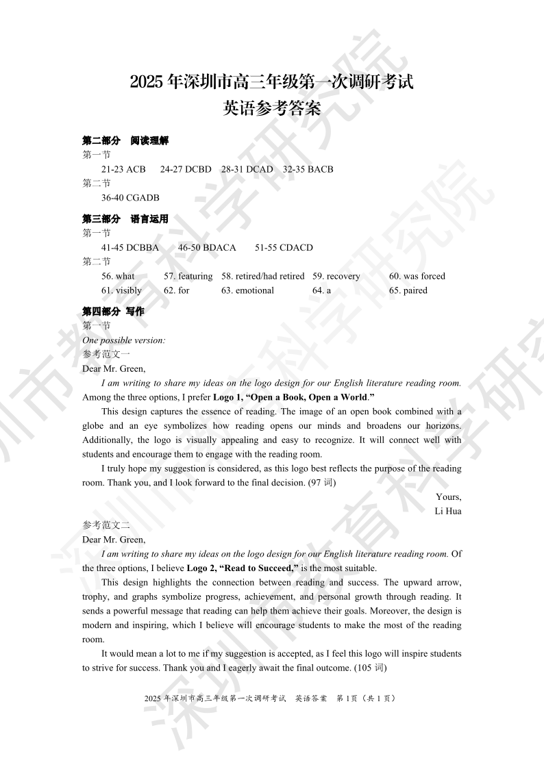 广东省深圳市2024-2025下学期高三第一次调研考试(一调)英语答案