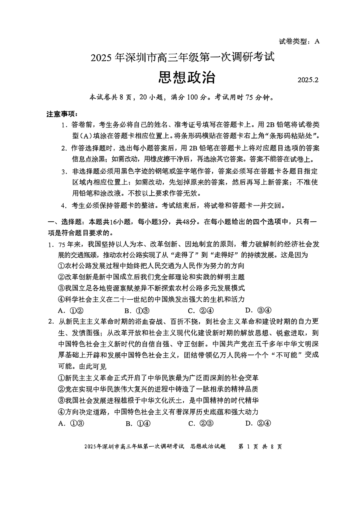 广东省深圳市2024-2025下学期高三第一次调研考试(一调)政治