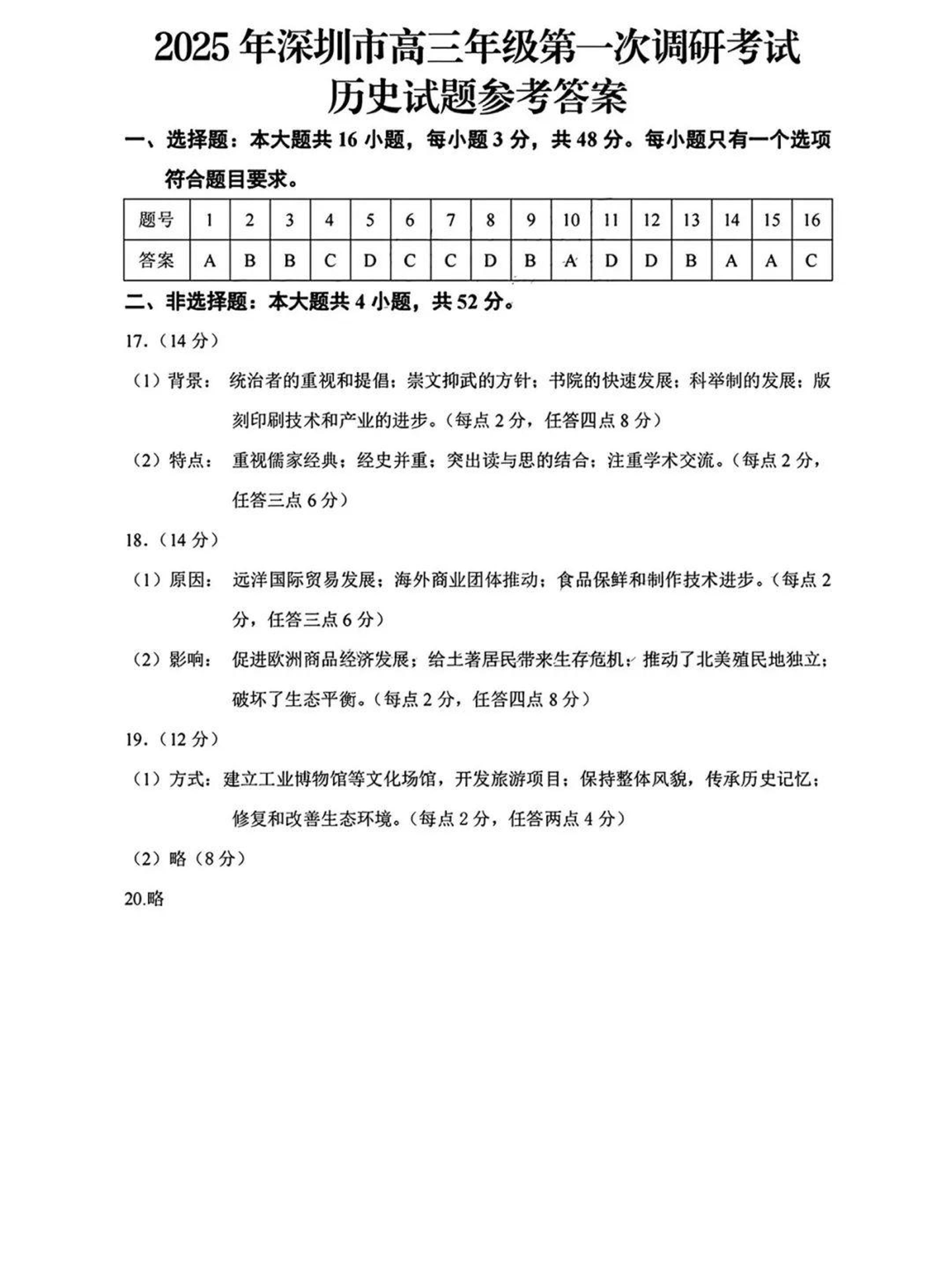 广东省深圳市2024-2025下学期高三第一次调研考试(一调)历史答案
