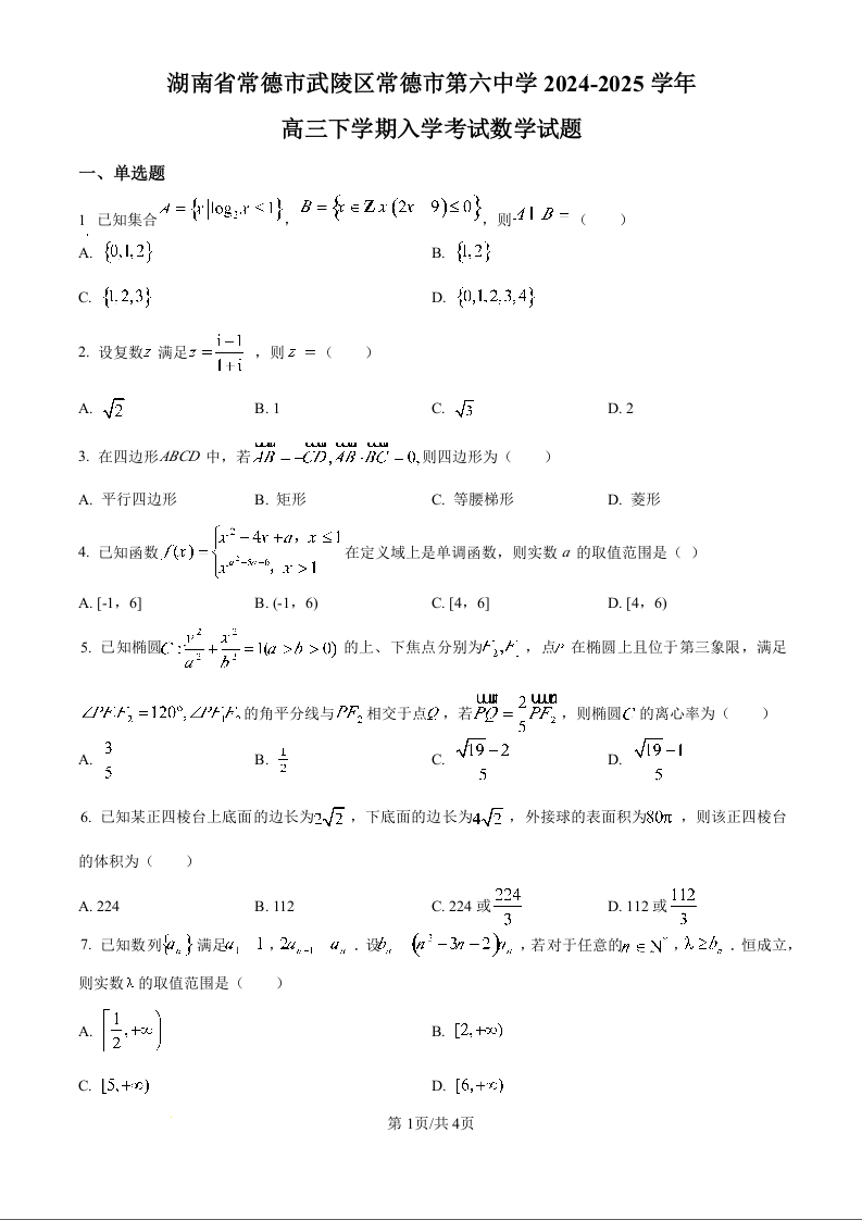 湖南省常德市第六中学2024-2025学年下学期高三开学考试数学(原卷版)