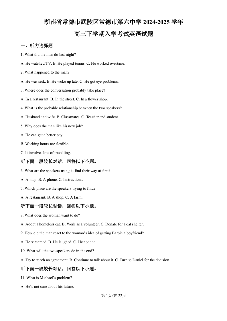湖南省常德市第六中学2024-2025学年下学期高三开学考试英语(精品解析版)