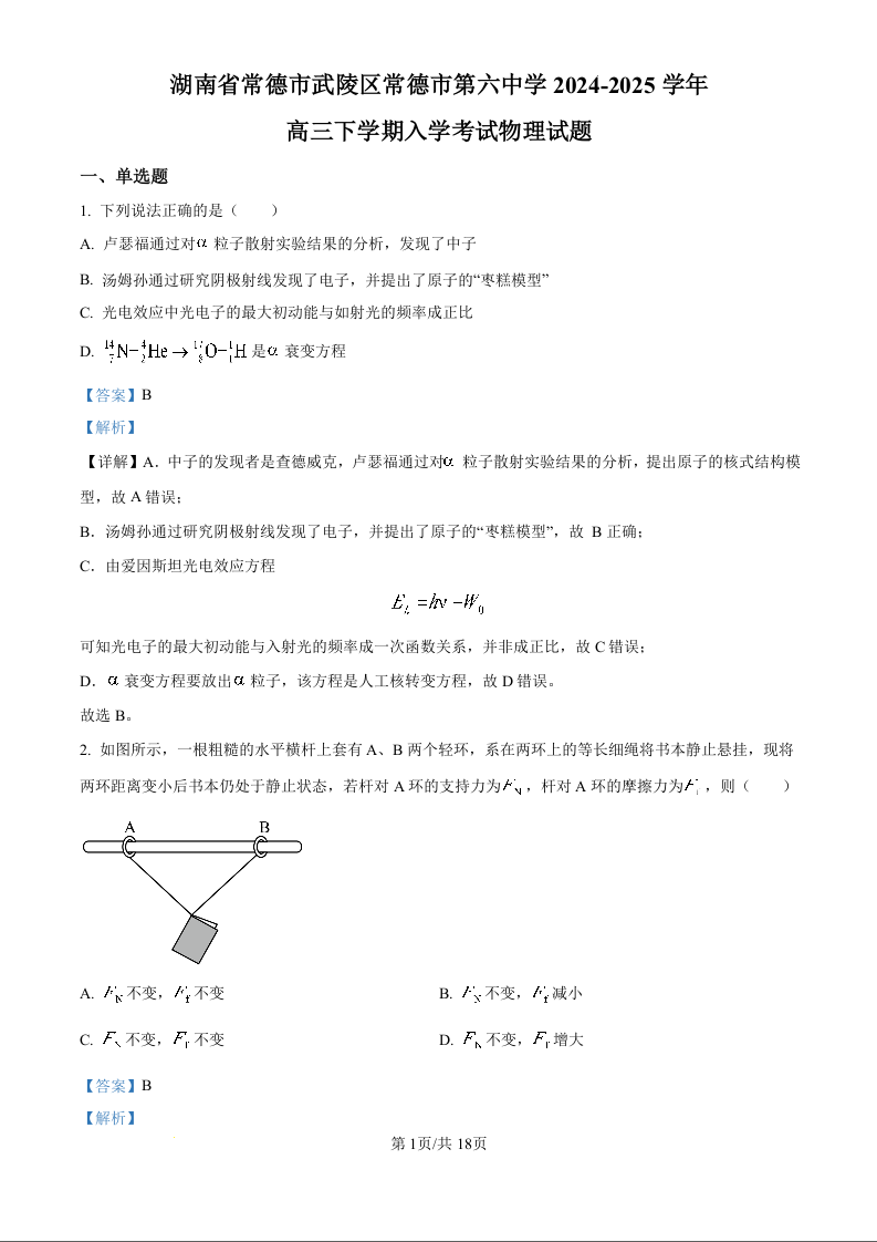 湖南省常德市第六中学2024-2025学年下学期高三开学考试物理(精品解析版)