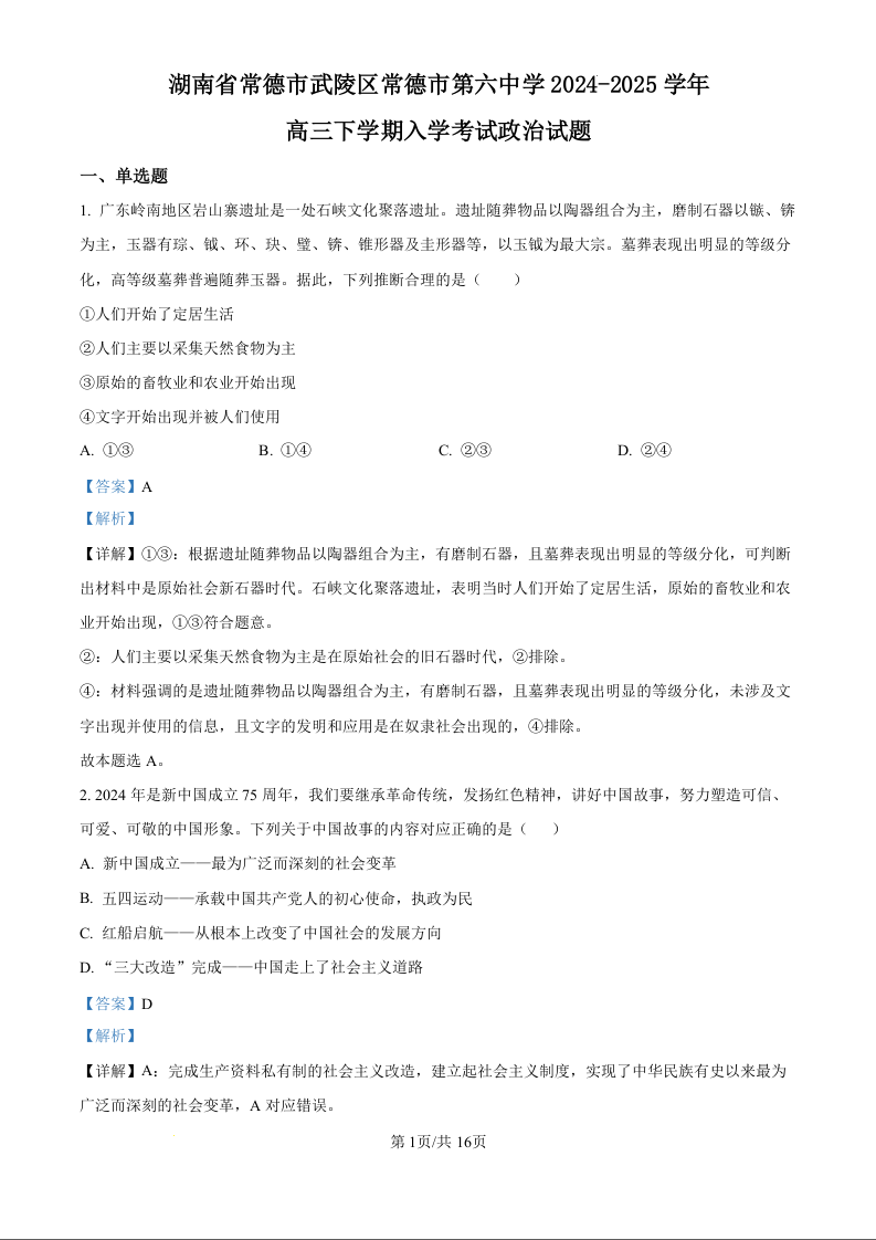 湖南省常德市第六中学2024-2025学年下学期高三开学考试政治(精品解析版)