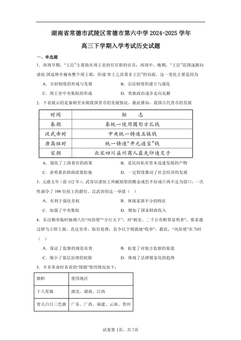 湖南省常德市第六中学2024-2025学年下学期高三开学考试历史+答案
