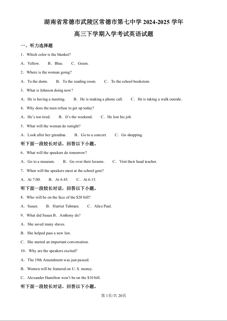 湖南省常德市第七中学2024-2025学年下学期高三开学考试英语(精品解析版)