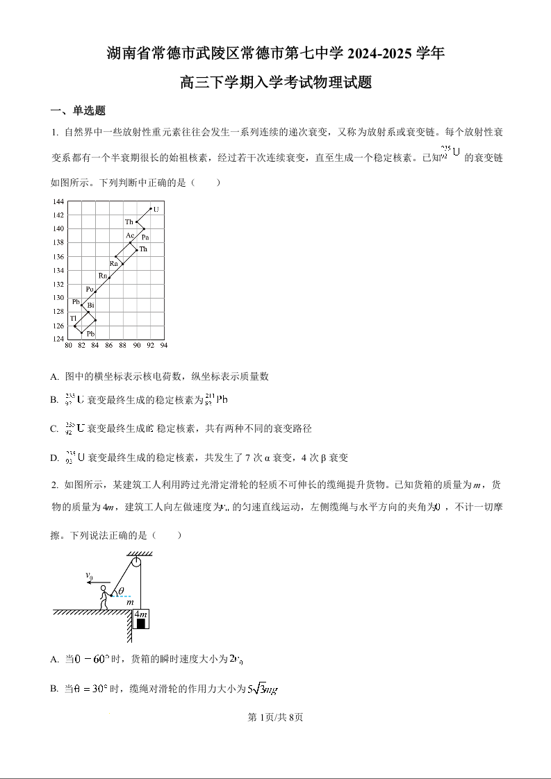 湖南省常德市第七中学2024-2025学年下学期高三开学考试物理(原卷版)