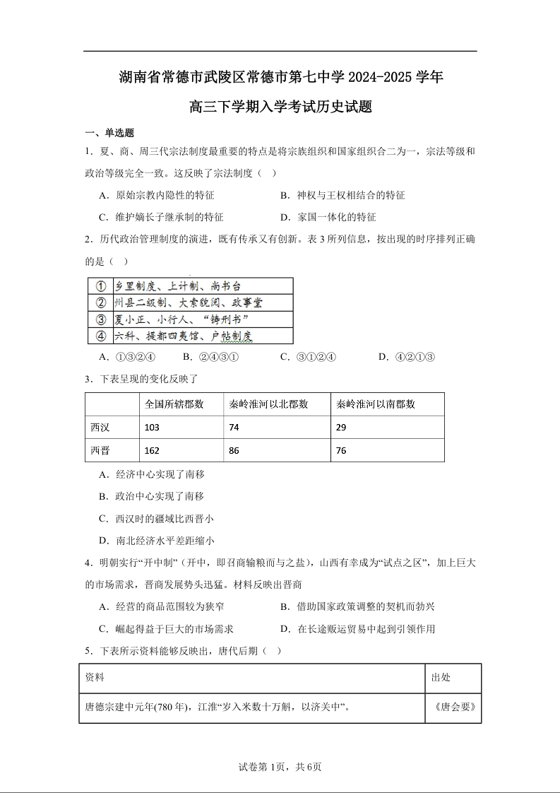 湖南省常德市第七中学2024-2025学年下学期高三开学考试历史+答案
