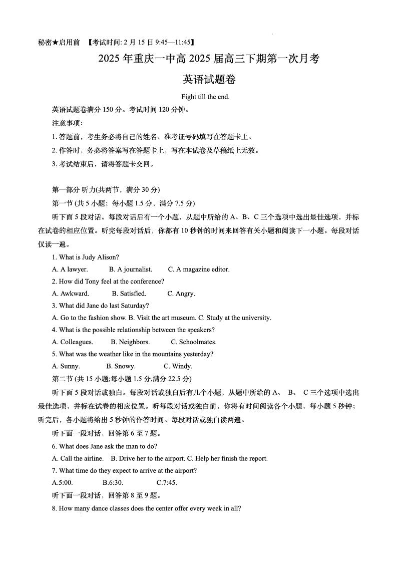 重庆市第一中学2024-2025学年下学期2月高三开学考试英语