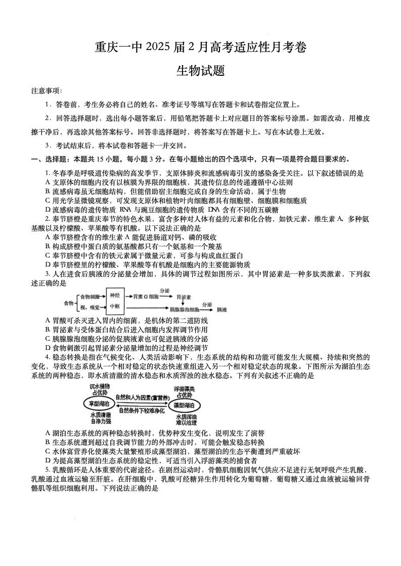 重庆市第一中学2024-2025学年下学期2月高三开学考试生物+答案