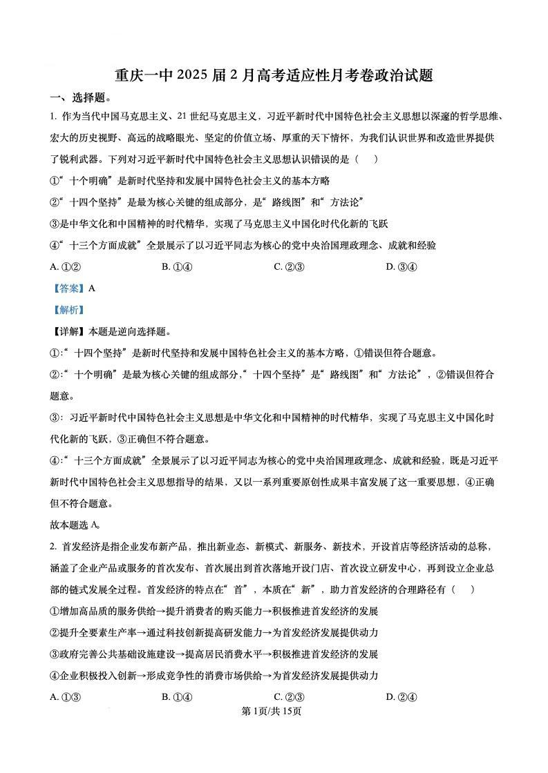 重庆市第一中学2024-2025学年下学期2月高三开学考试政治答案