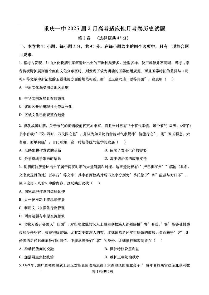 重庆市第一中学2024-2025学年下学期2月高三开学考试历史