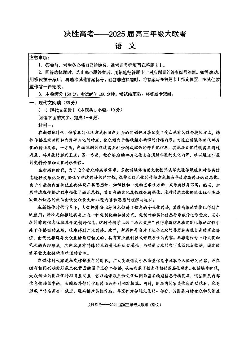 江苏省苏州市九校2024-2025学年下学期2月高三联考语文+答案