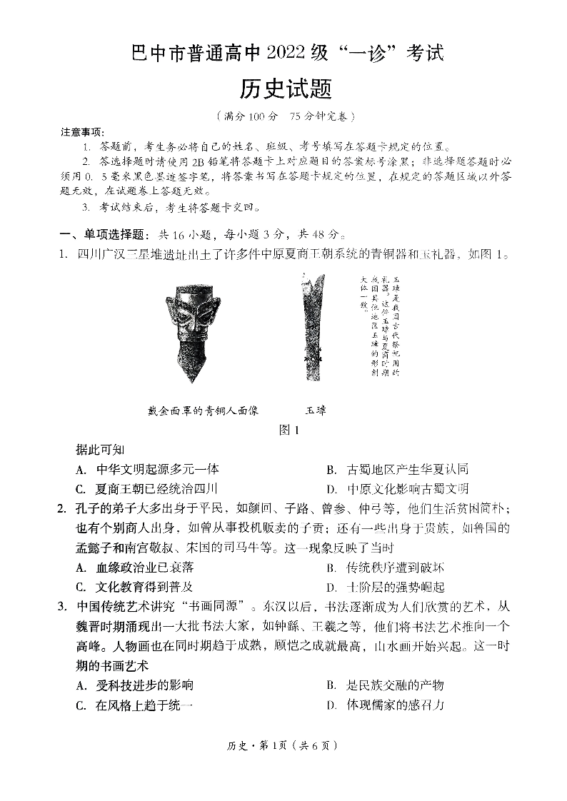 四川省巴中市2024-2025学年下学期高三一诊考试历史