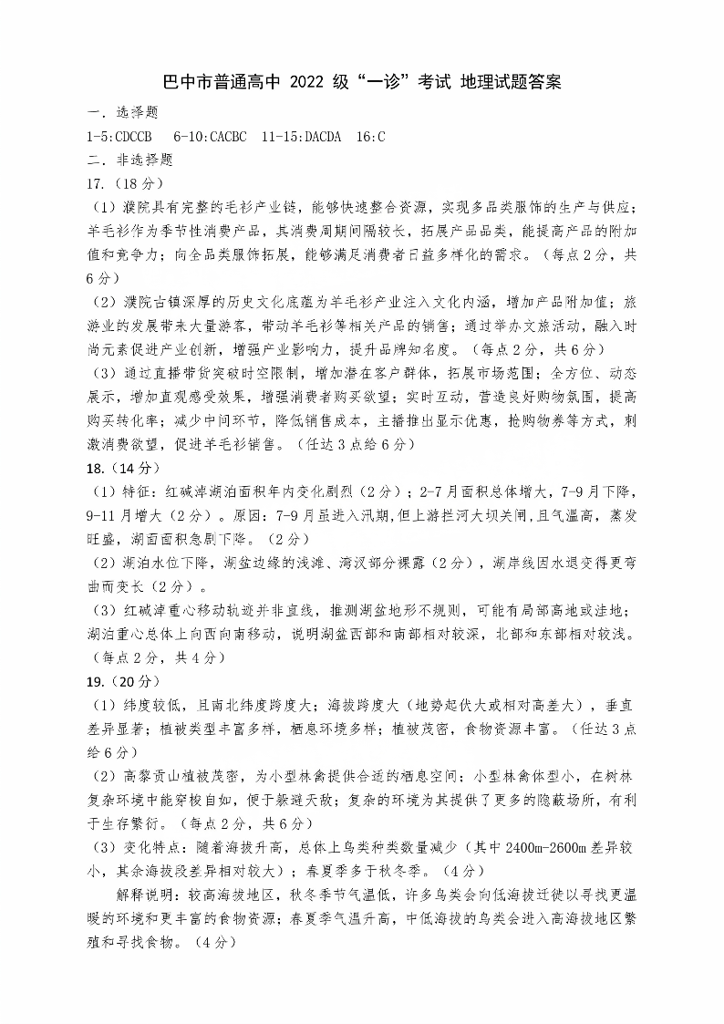 四川省巴中市2024-2025学年下学期高三一诊考试地理答案