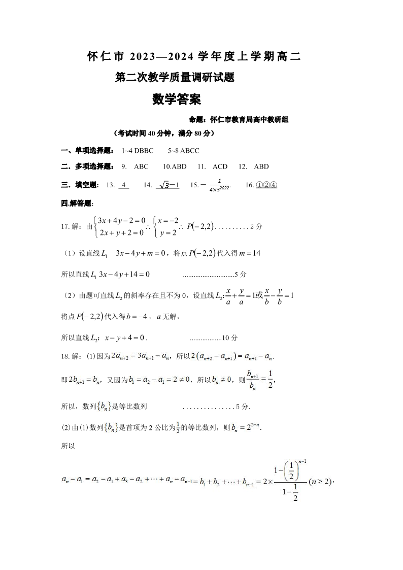 山西省朔州市怀仁市2023-2024学年高二上学期1月期末考试数学答案