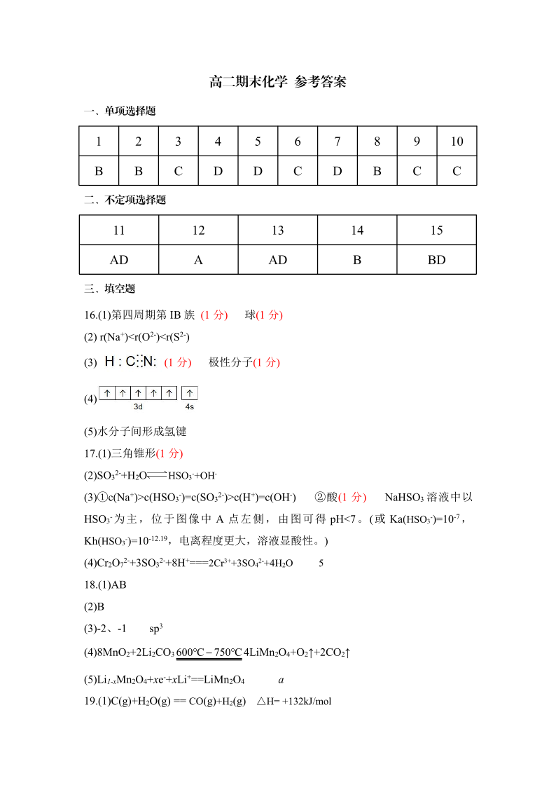 陕西省安康市2023-2024学年高二上学期期末考试化学答案