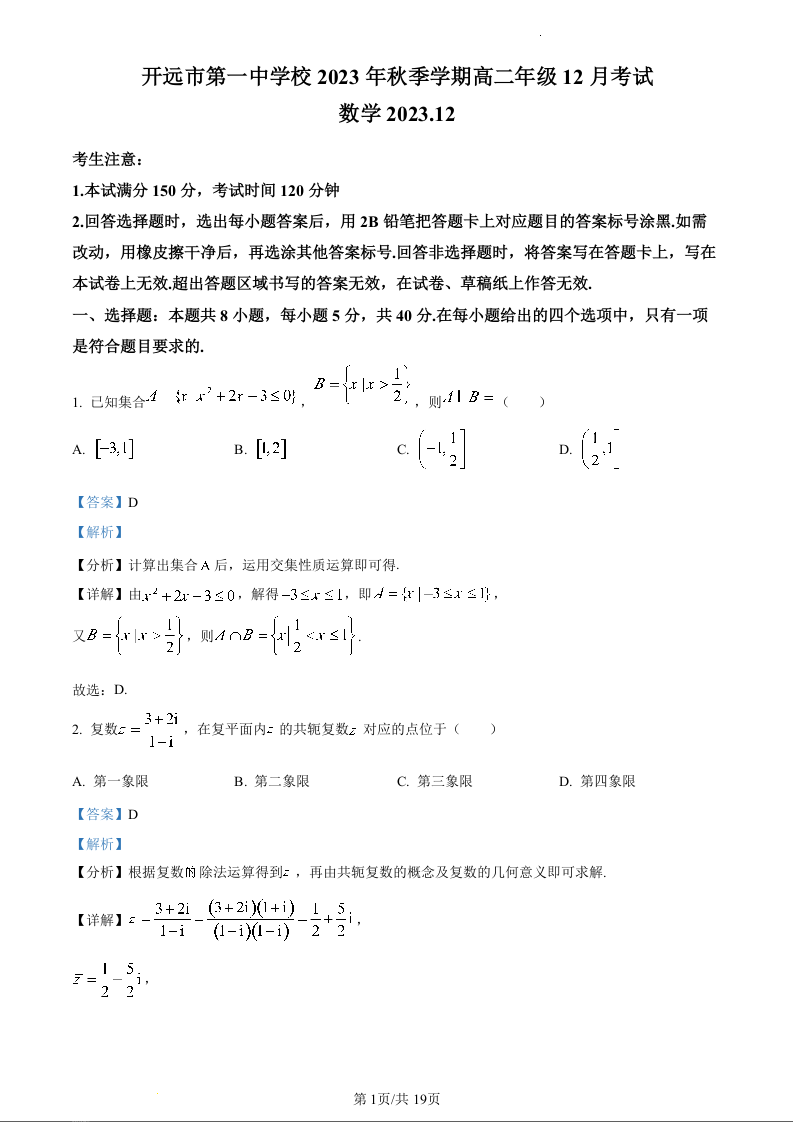 云南省开远市第一中学校2023-2024学年高二上学期12月月考数学(精品解析版)