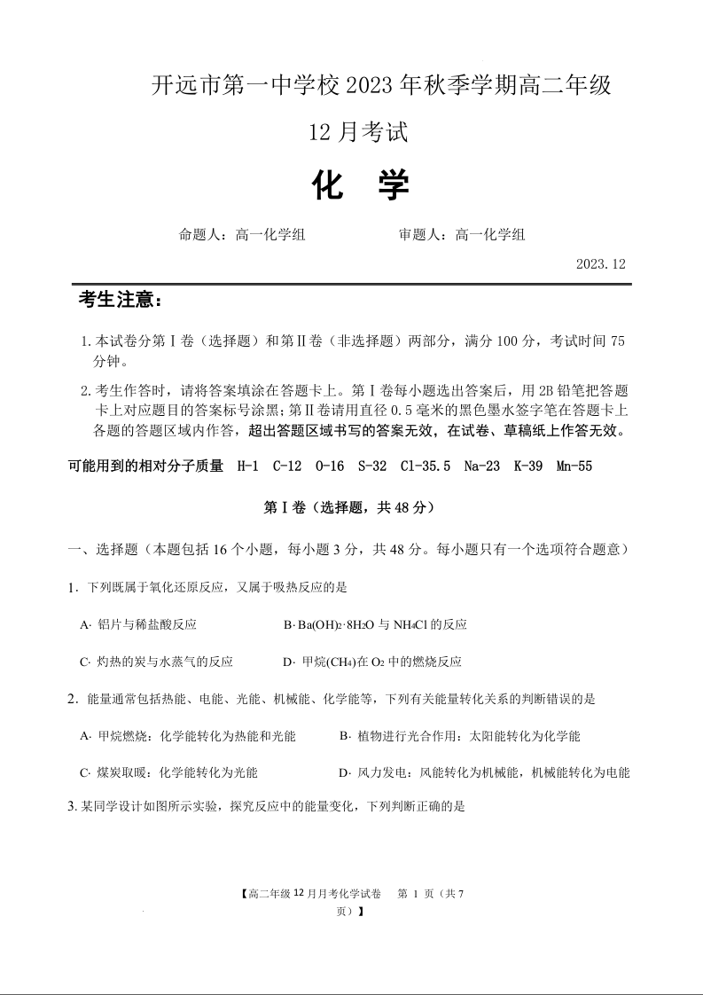 云南省开远市第一中学校2023-2024学年高二上学期12月月考化学