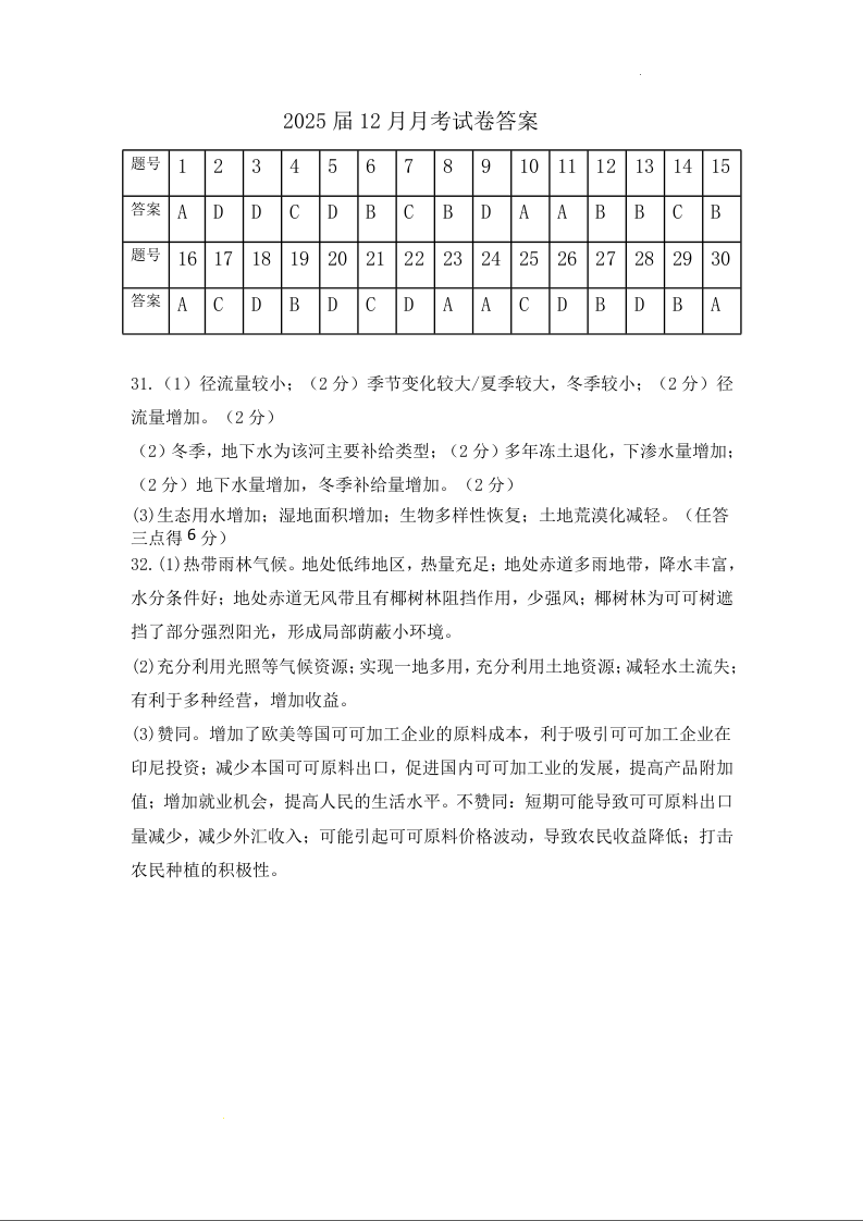 云南省开远市第一中学校2023-2024学年高二上学期12月月考地理答案