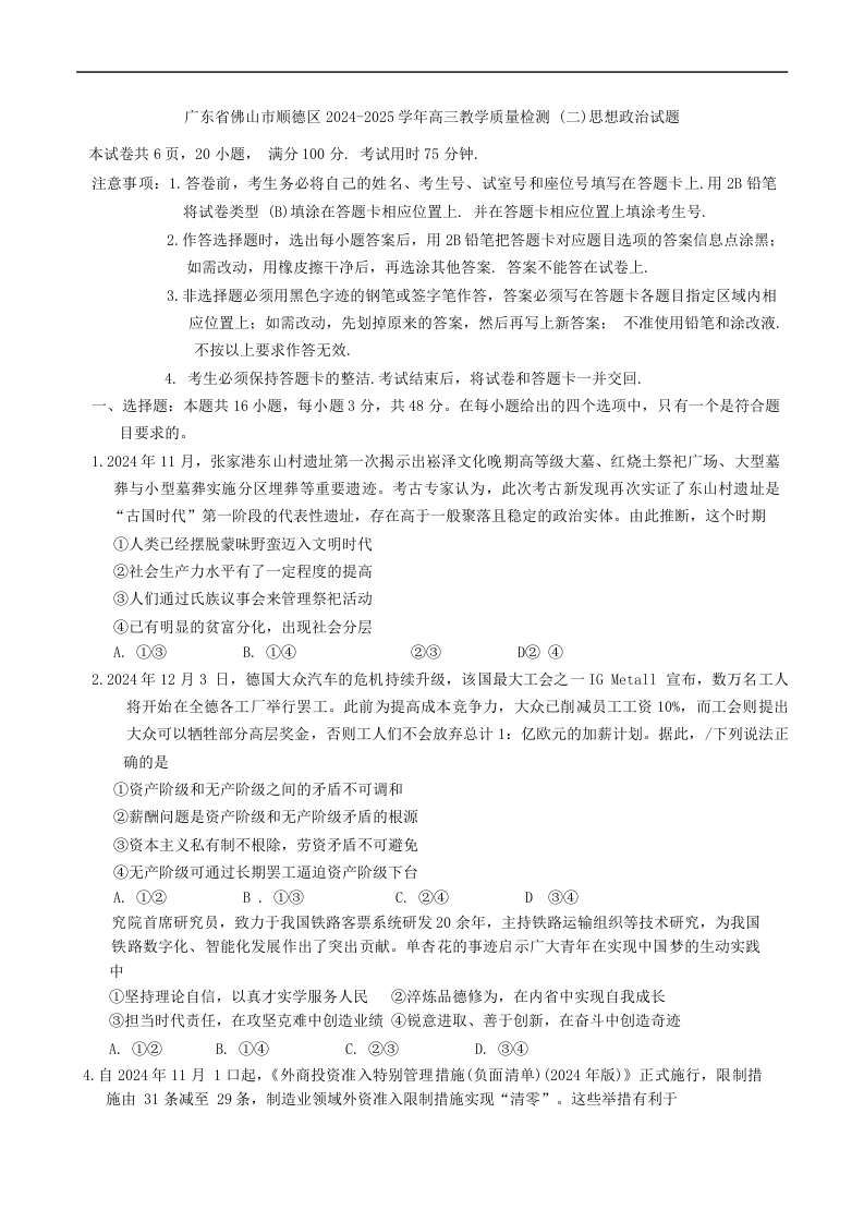 广东省佛山市顺德区2024-2025学年下学期高三教学质量检测(二)政治+答案