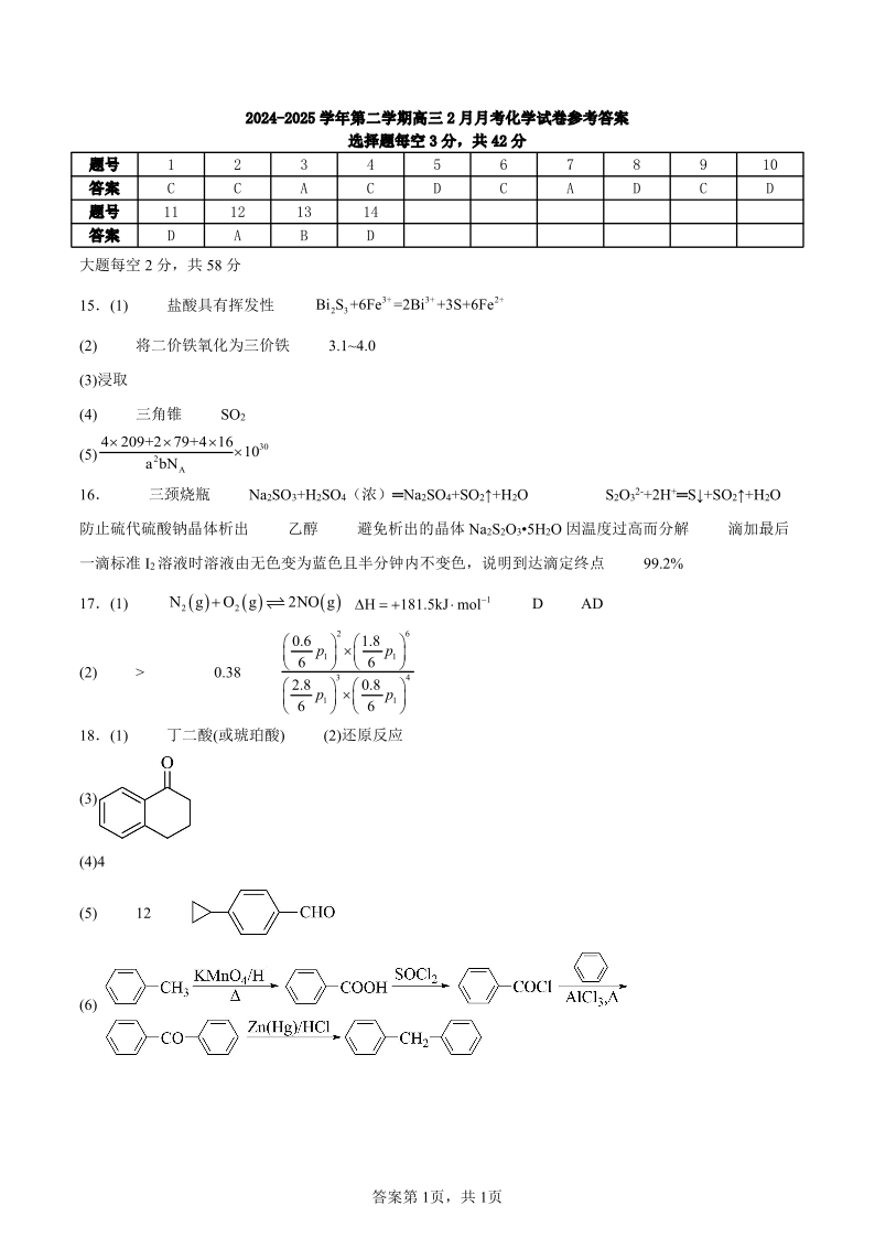 江西省南昌市第十九中学2024-2025学年下学期2月高三月考测试化学答案