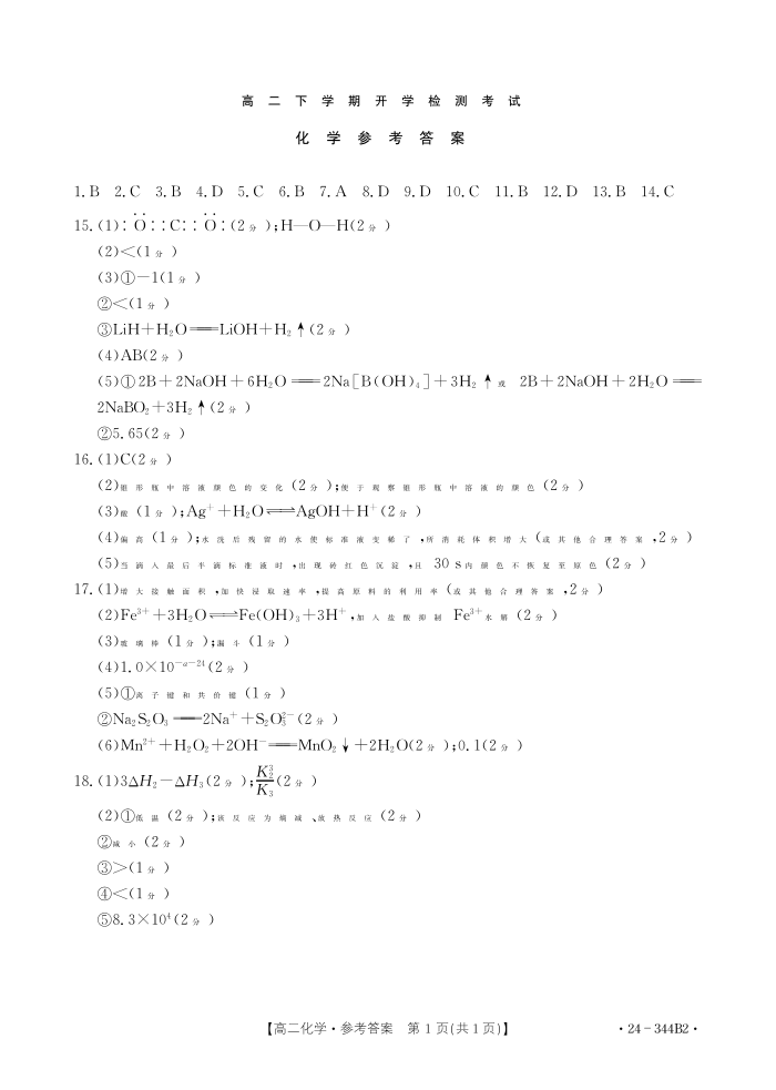 河北省保定市部分高中2023-2024学年高二下学期开学检测考试化学答案
