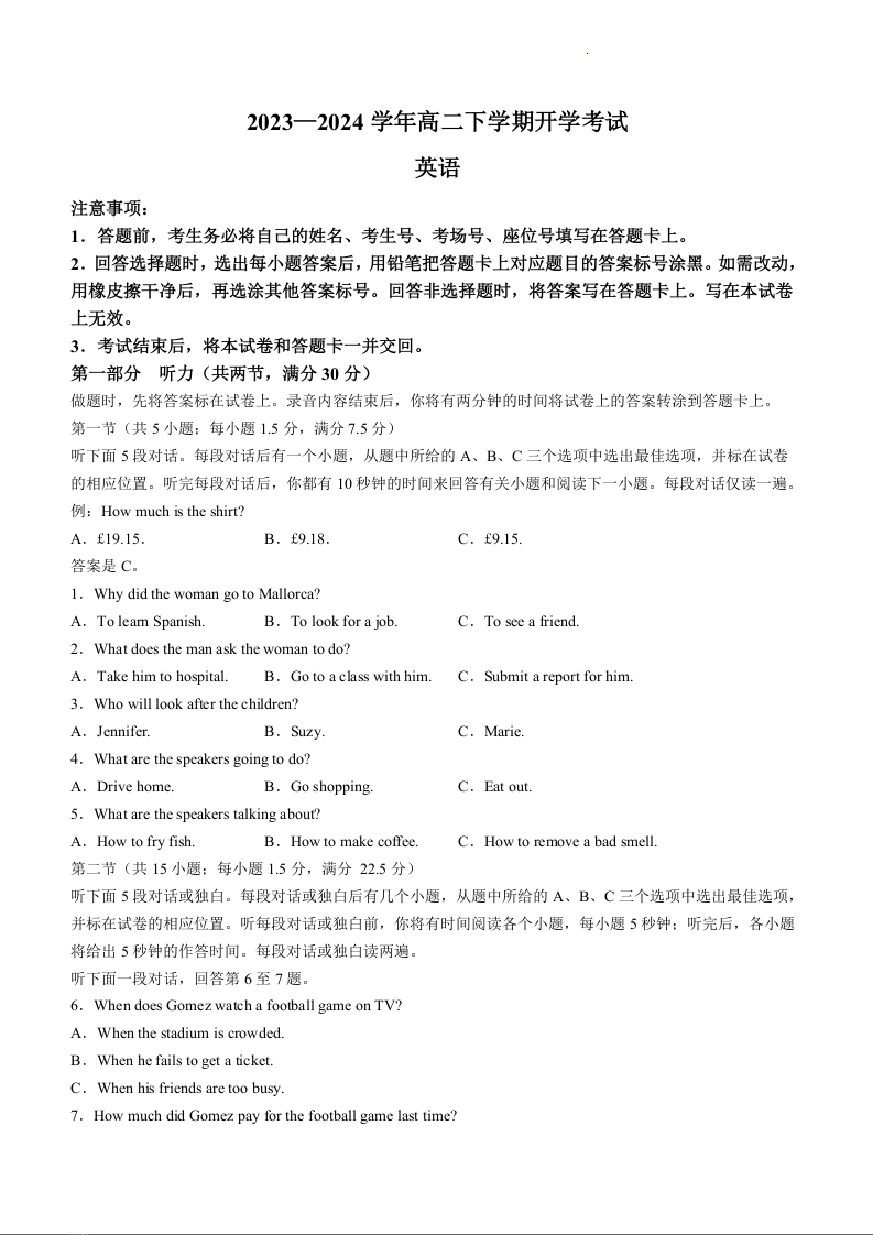 河南省许平汝名校2023-2024学年高二下学期开学考试英语+答案
