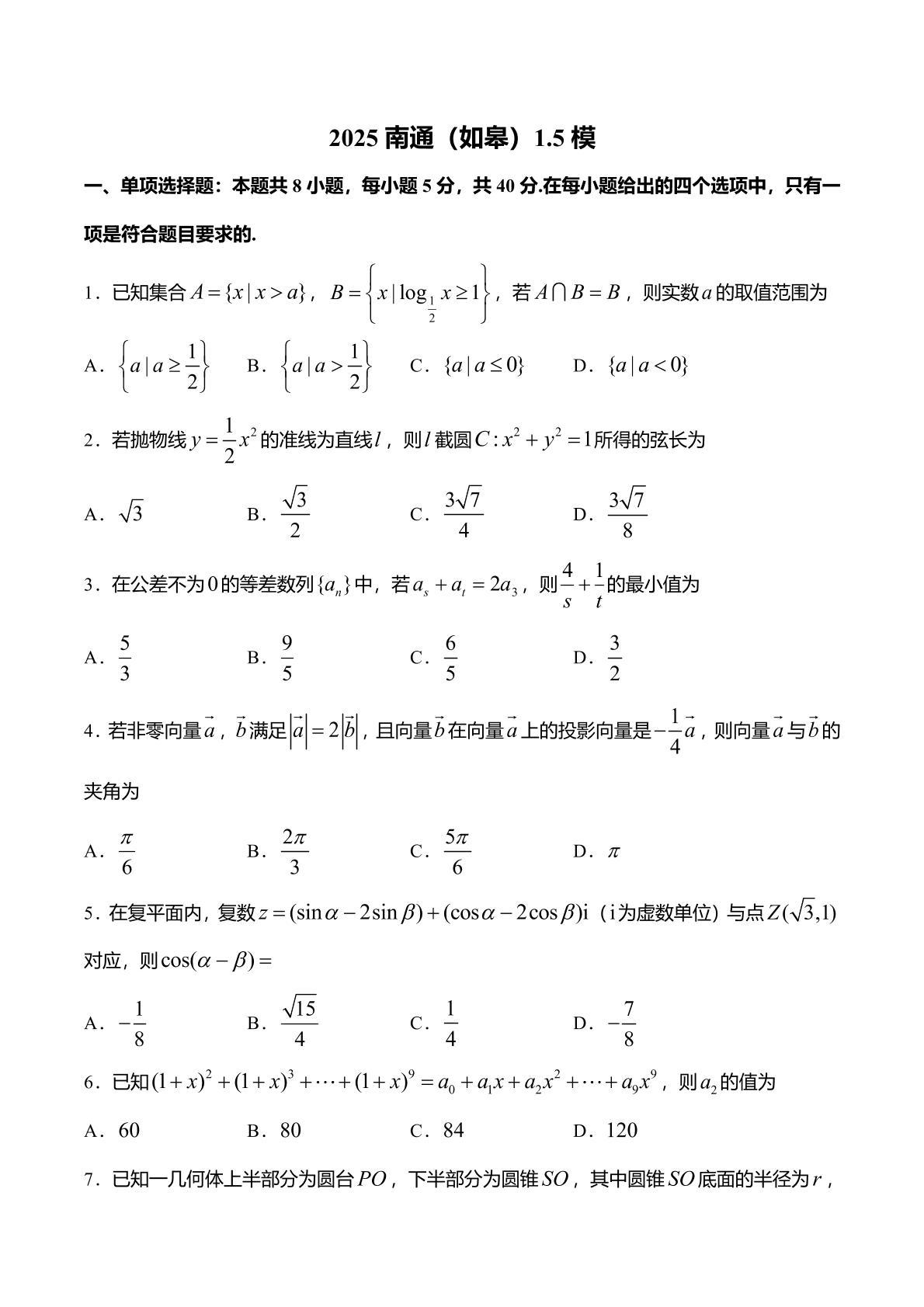 江苏省南通市如皋市2024-2025学年高三第一次适应性考试数学+答案