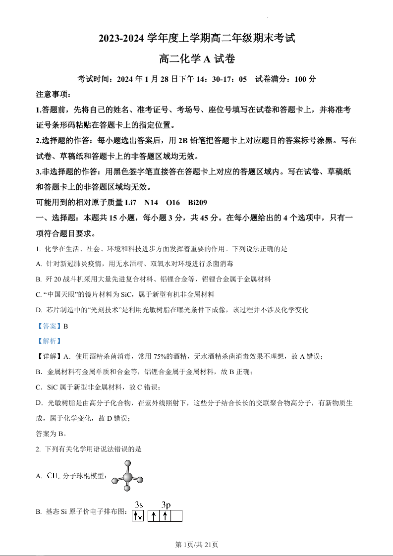 湖北省新高考联考协作体2023-2024学年高二上学期1月期末考试化学(精品解析版)