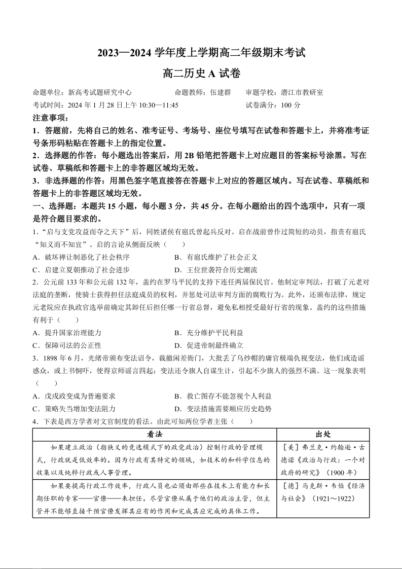 湖北省新高考联考协作体2023-2024学年高二上学期1月期末考试历史+答案