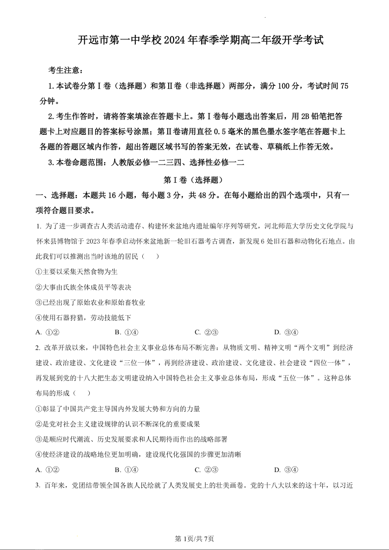 云南省开远市第一中学校2023-2024学年高二下学期开学考试政治(原卷版)
