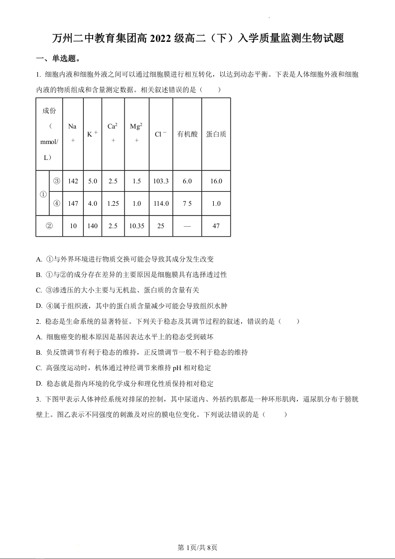 重庆市万州二中教育集团2023-2024学年高二下学期入学质量监测生物(原卷版)