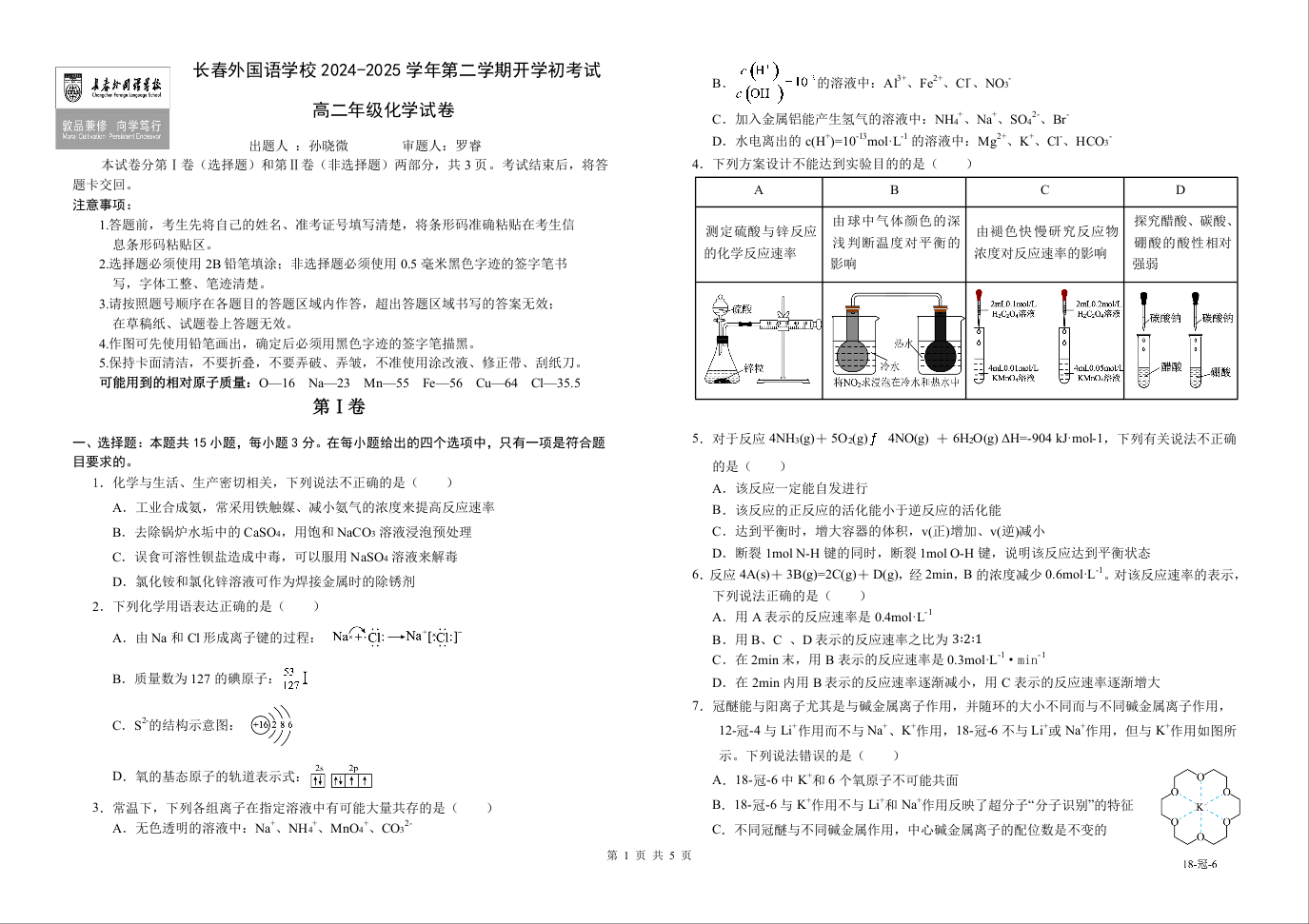 吉林省长春市外国语学校2024-2025学年下学期高二开学考试化学+答案