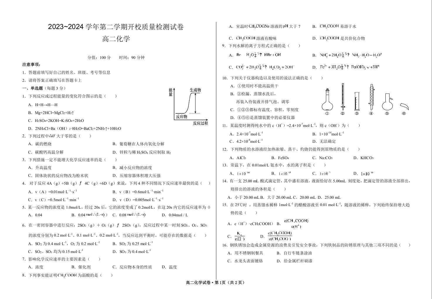 甘肃省武威市凉州区2023-2024学年高二下学期开校质量检测化学