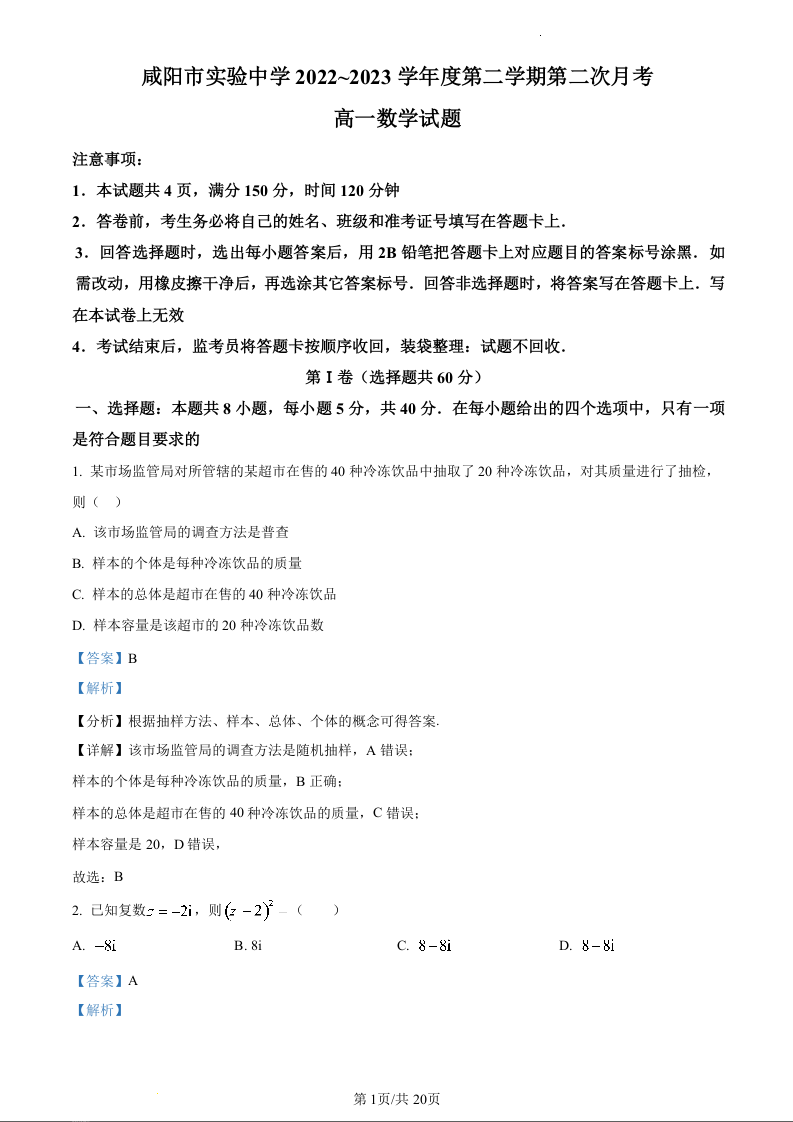 陕西省咸阳市实验中学2022-2023学年高二下学期第二次月考数学(精品解析版)