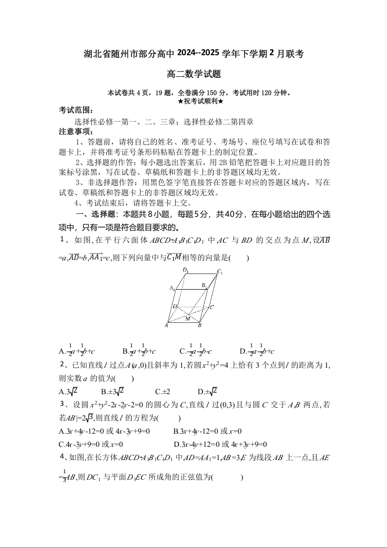 湖北省随州市部分高中2024-2025学年下学期2月高二联考数学