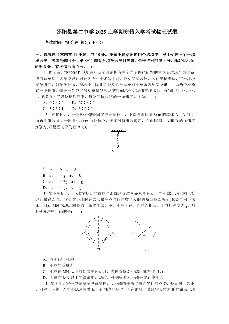 湖南省邵阳市邵阳县二中2024-2025学年下学高二期入学考物理