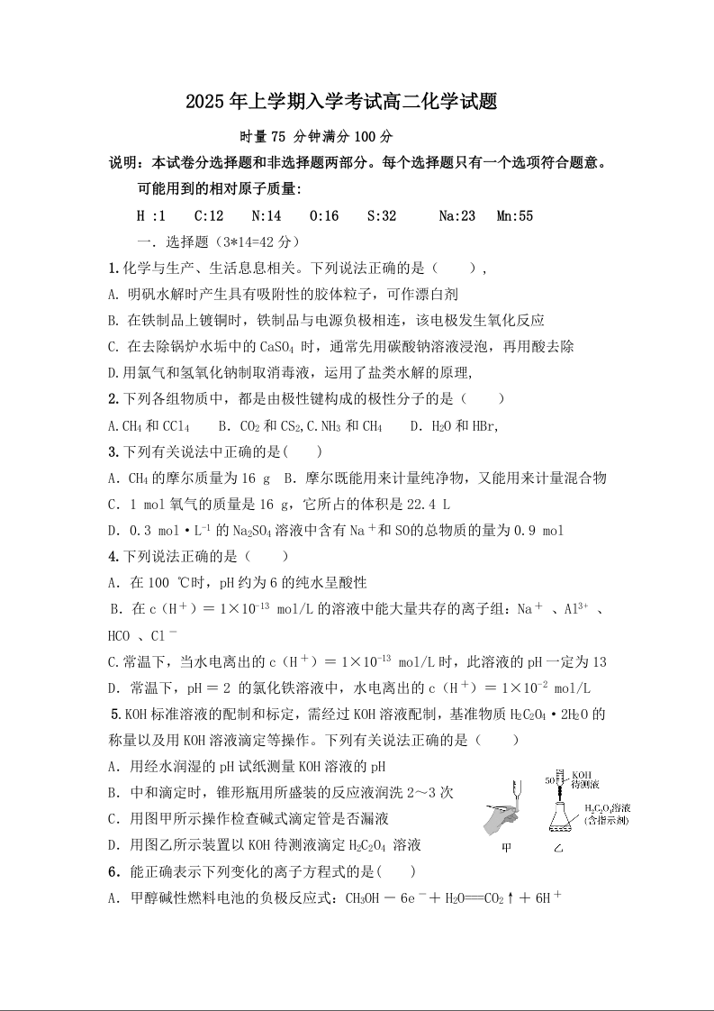 湖南省邵阳市邵阳县二中2024-2025学年下学高二期入学考化学