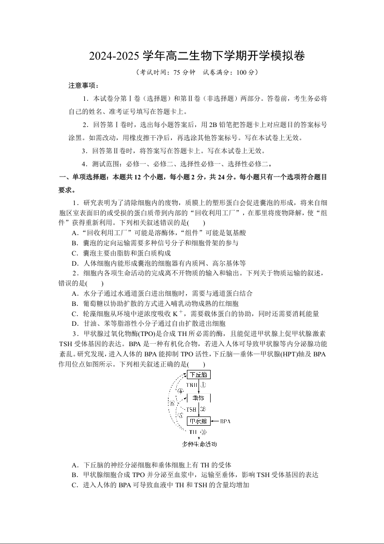 湖南省邵阳市邵阳县二中2024-2025学年下学高二期入学考生物