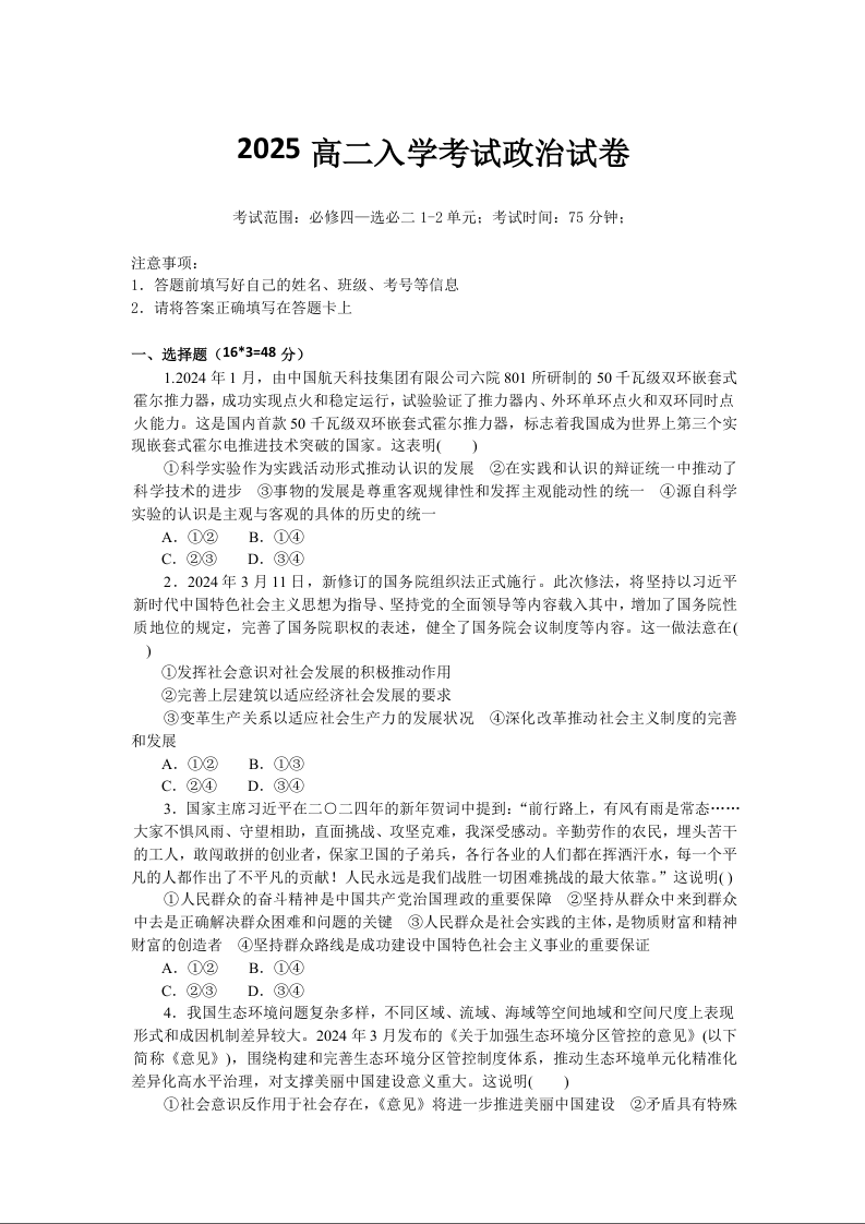湖南省邵阳市邵阳县二中2024-2025学年下学高二期入学考政治