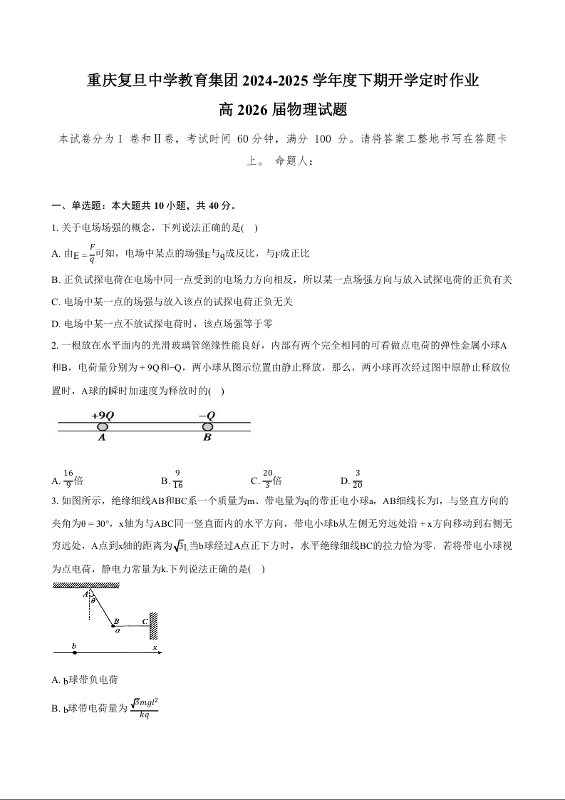 重庆市复旦中学2024-2025学年下学期高二开学定时作业物理