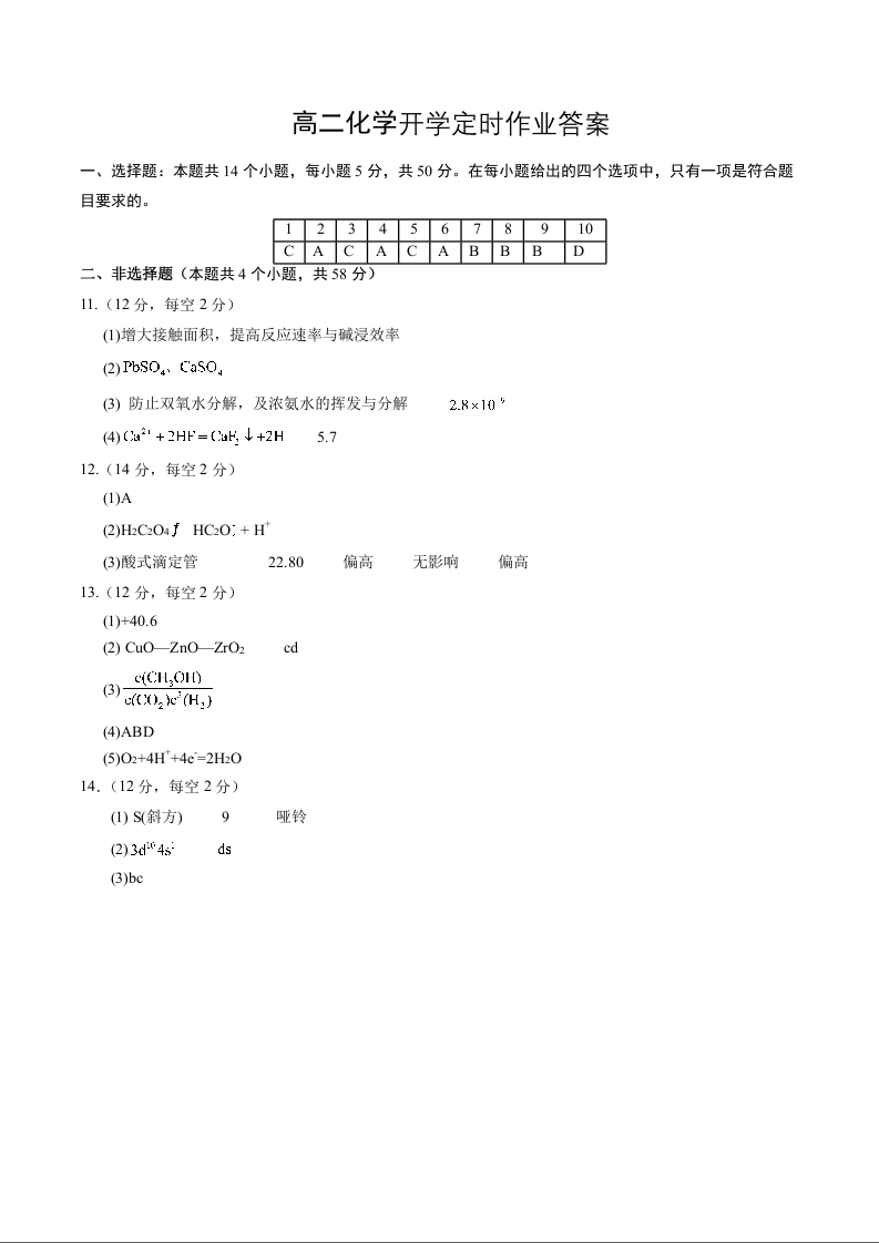 重庆市复旦中学2024-2025学年下学期高二开学定时作业化学答案