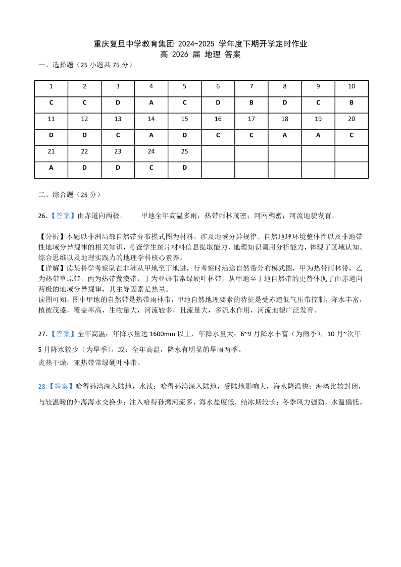 重庆市复旦中学2024-2025学年下学期高二开学定时作业地理答案