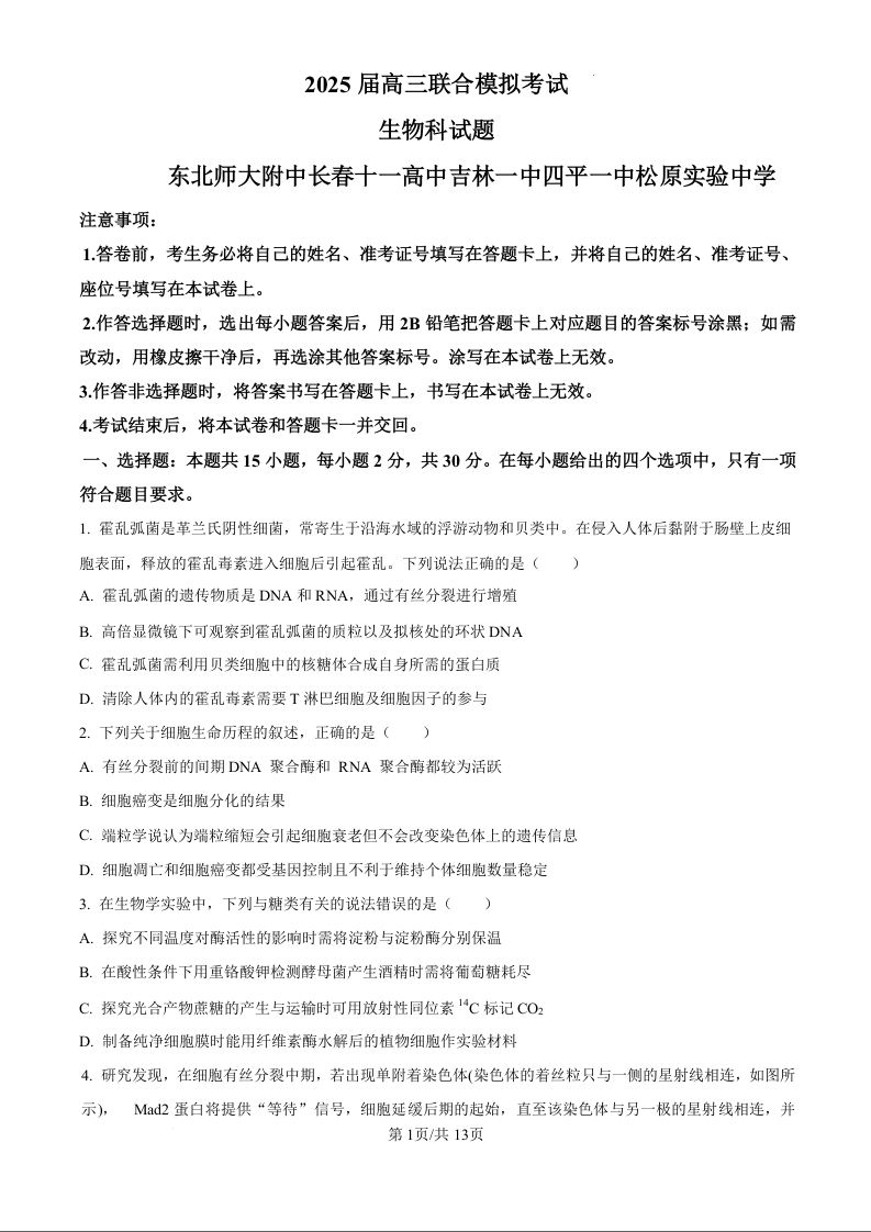 吉林省东北师大附中(五校联考)20224-2025学年上学期1月高三期末考试生物(原卷版)